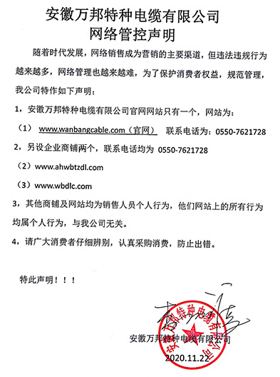 鄭重聲明:安徽萬邦特種電纜有限公司官方網站為:www_wanbangcable_com.gvme.cn,除此之外無任何子網站或合作網站,其余均為假冒偽劣。電話:0550-7621728 13485756353 地 址:安徽省天長市滁州高新技術產業開發區經四路29號